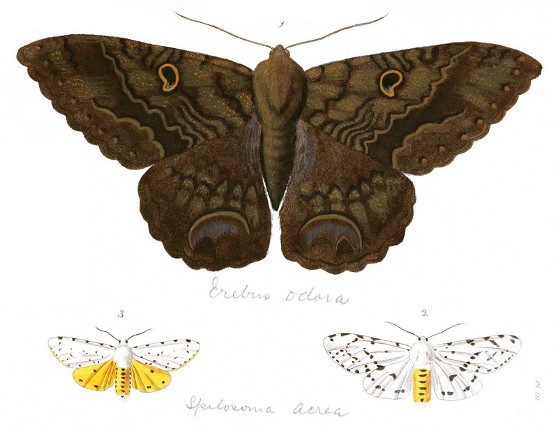 Black Witch Moth (Ascalapha odorata), Salt Marsh Moth (Estigmene acrea) Description moths, 1=Black Witch, Ascalapha odorata; 2, 3=Spilosoma acrea (Salt marsh moth, Estigmene acrea)