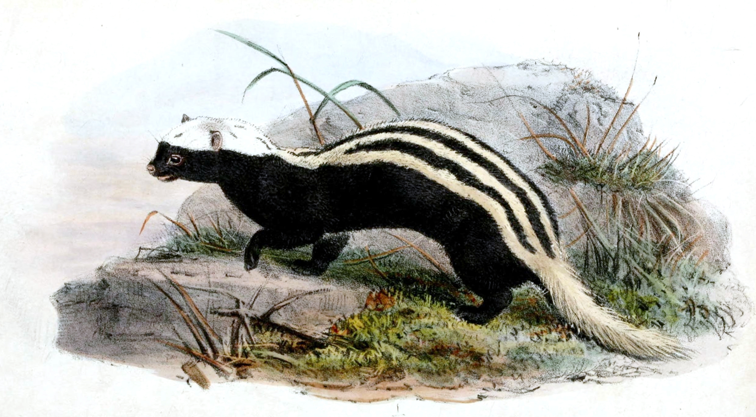 The African striped weasel (Poecilogale albinucha), the lone member of its genus, is a small, black and white weasel native to sub-Saharan Africa. African striped weasels inhabit much of Africa south of the equator. They are found from the Democratic Republic of the Congo across to Kenya in the north, and as far south as southern South Africa.