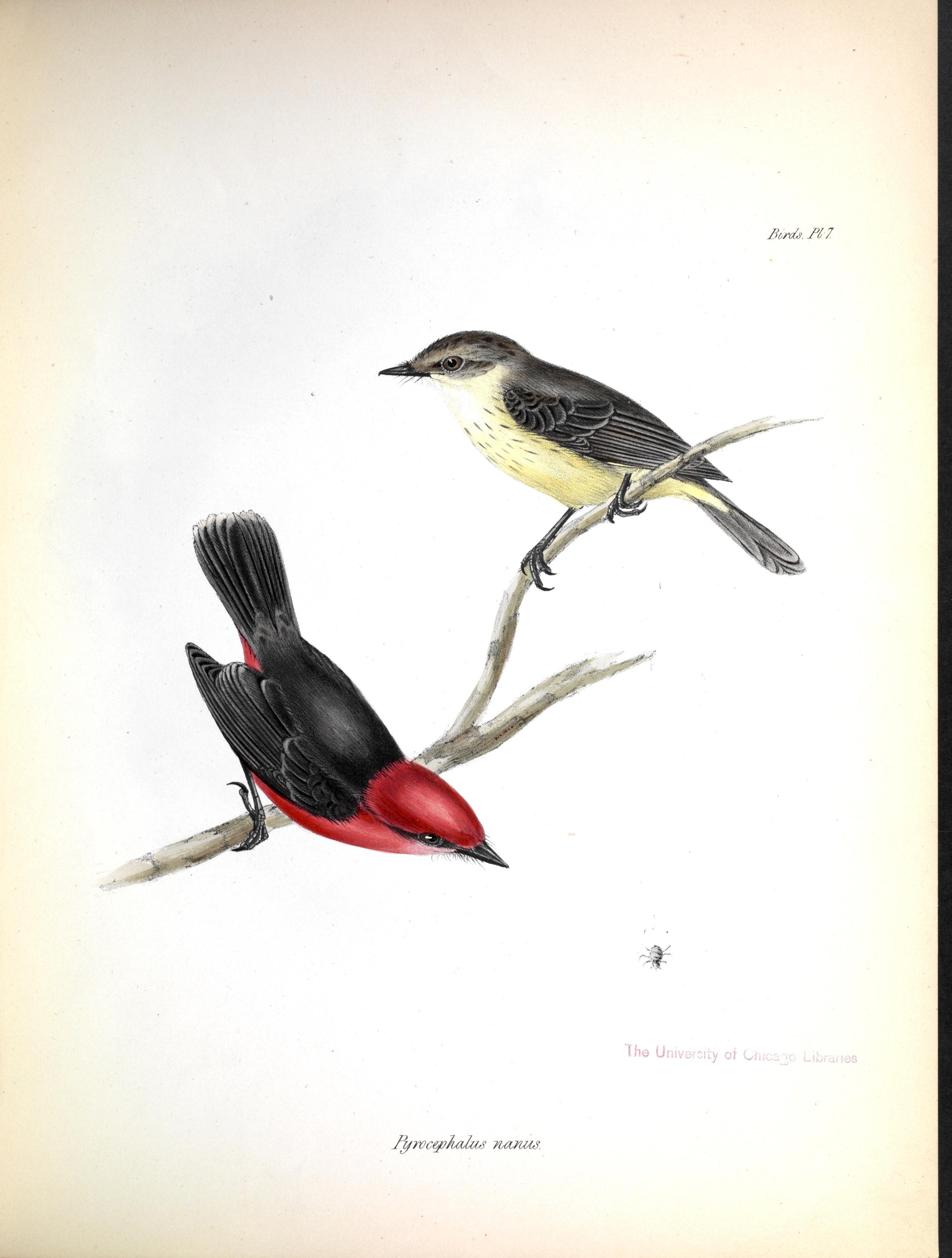English: origninal illustration of Darwin's flycatcher (Pyrocephalus nanus)