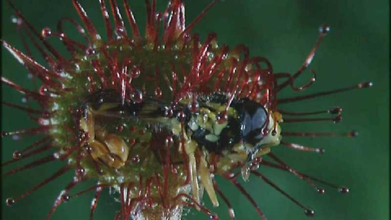 and the sweet pollen, the drosera excretes a sticky juice and captures them.