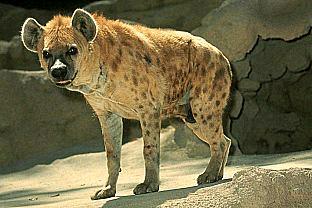 | Spotted Hyena, or Laughing Hyena, (Crocuta crocuta) is a mammal of the order Carnivora. They are moderately large, terrestrial carnivores native to Africa. They are best known for croaking, birdlike bark that resembles the sound of hysterical human laughter. Though often labeled incorrectly as a scavenger, the spotted hyena is actually a powerful hunter, the majority of its nourishment being derived from live prey. Spotted hyenas are the most common predator in sub-saharan Africa, living in savannah, dry woodland and desert habitats. |