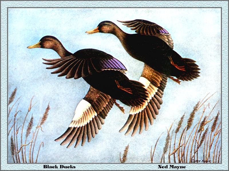 [Animal Art - Ned Mayne] American Black Duck pair in flight (Anas rubripes) {!--미국오리--> From: Charles Perrien
