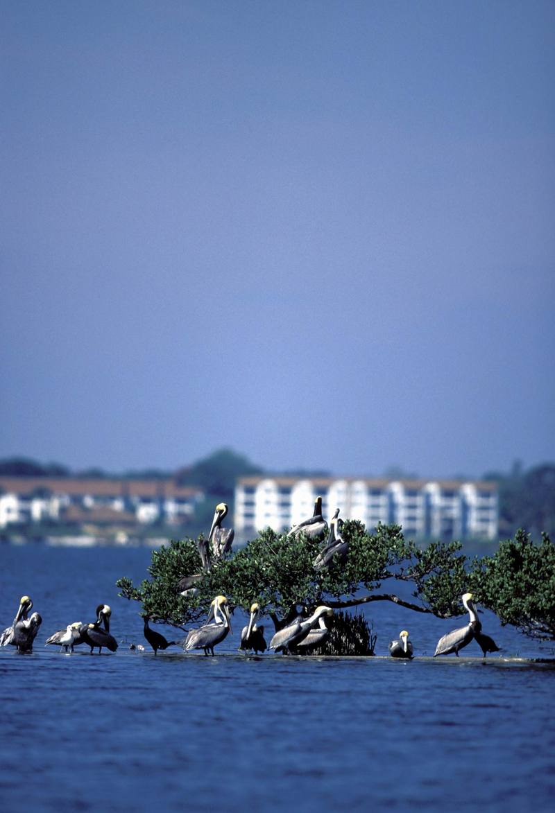Abstract: Brown pelicans perch barely above the water line on Pelican Island National Wildlife Refuge.