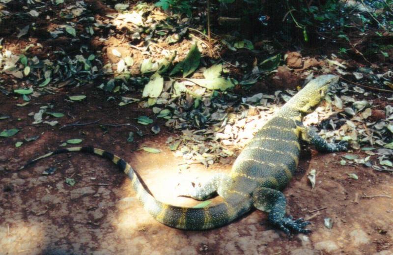 | The Nile monitor (Varanus niloticus) is a large member of the monitor lizard family (Varanidae). Nile monitors grow to about 6 to 7 feet in length. They have muscular bodies, strong legs and powerful jaws full of sharp teeth. They also possess sharp claws used for climbing, digging, defense, or tearing at their prey. Like all monitors they have a forked tongue, which facilitates their sense of smell. |