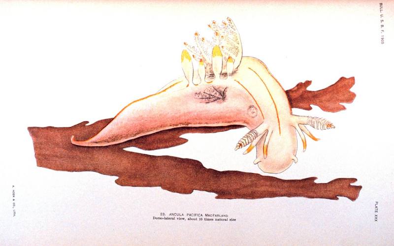 Nudibranch. 23. Ancula pacifica MacFarland - Dorso-lateral view. 23 painted by Anna B. Nash of the Hopkins Seaside Laboratory. In: "Opisthobranchiate Mollusca from Monterey Bay ....", Bulletin of the Bureau of Fisheries, Volume 25, 1905. P. 151, Plate XXX.