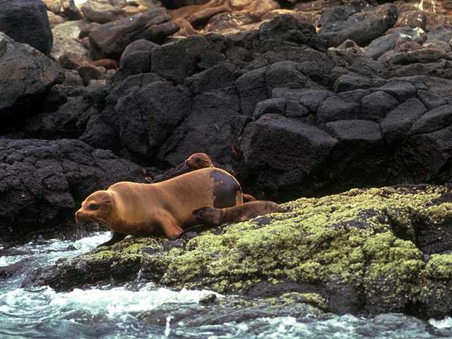 The Galapagos sea lion is found in the Gal??pagos Archipelago where it is one of the most conspicuous and numerous marine mammals. Well adapted to its semi-aquatic lifestyle, it has a streamlined body and powerful fins, and as a member of the eared seals (Otariidae family), which includes fur seals and sea lions; this aquatic mammal is able to control its hind flippers independently. This adaptation allows it more agility on land than seals, which cannot move their hind limbs independently. Furthermore, unlike the true seals (family Phocidae), the Galapagos sea lion swims using its strong and well developed fore flippers. Adult males are much larger than females and are brown in colour while females are a lighter tan. Adult males are also distinguished by their raised foreheads, and the hair on the crest may be a lighter colour. Juvenile Gal??pagos sea lions are chestnut brown in colour and measure around 75 cm at birth.