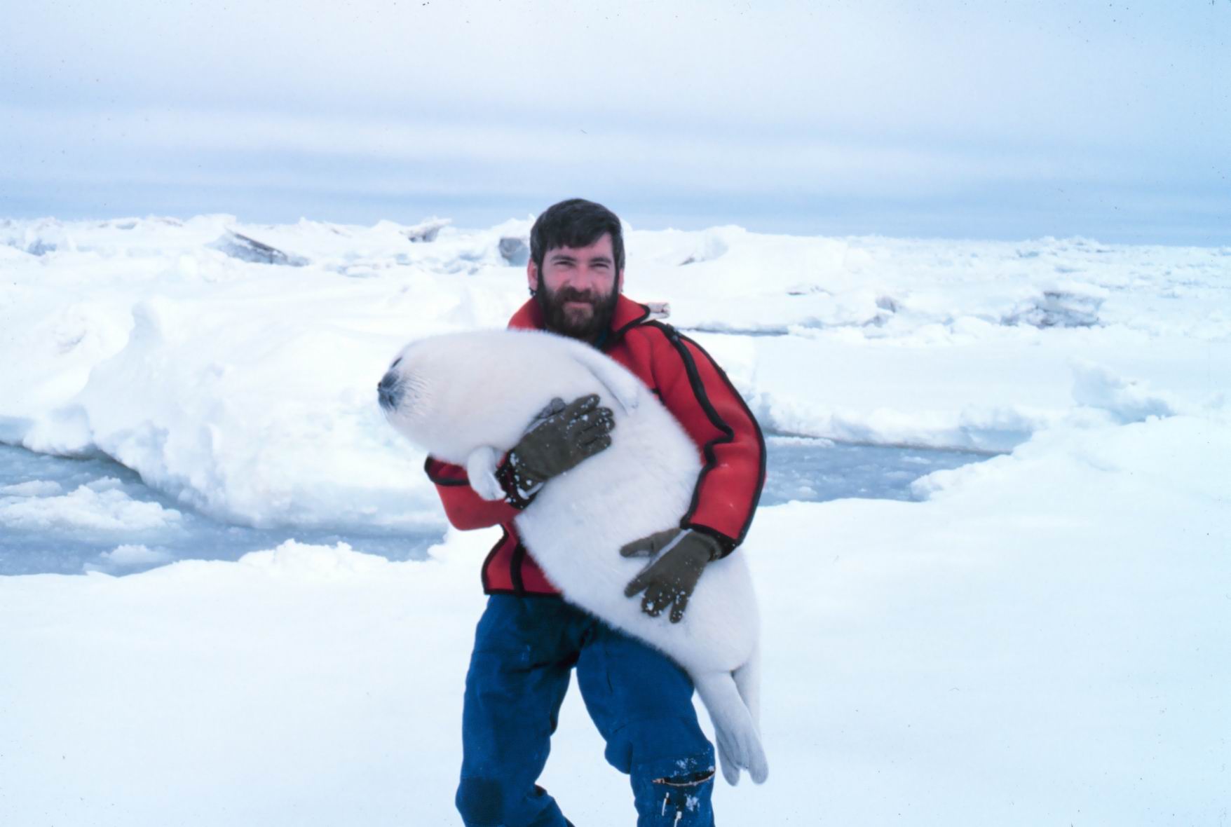 Budd Christman and a new friend - a ribbon seal pup, Phoca fasciata
