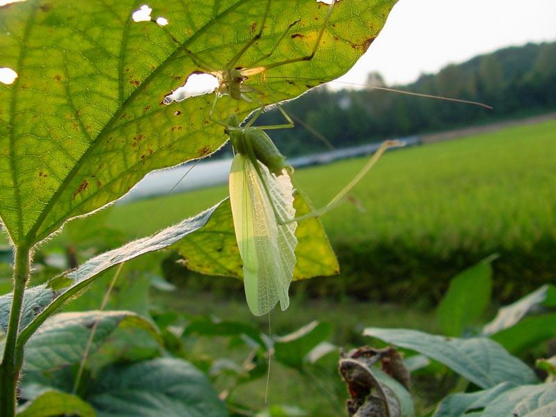 대전시 유성구 충남대학교 농과대학 농장(한빛아파트와 경계한 울타리 밑에서...) - 갓 탈피를 마치고 날개를 말리고 있는 실베짱이 | |
