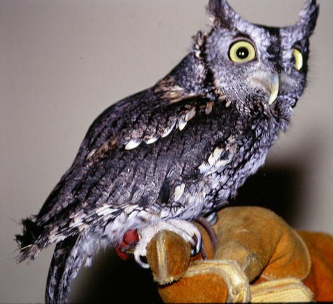 Grey phase screech owl photo taken at a raptor conservancy program