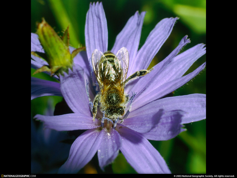 "Tiny titan of U.S. agriculture, a foraging honeybee flies as far as four miles [six kilometers] from its hive to find food???in this case, chicory pollen???yet usually visits only one type of flower during a single sortie. This floral fidelity helps make bees ideal crop pollinators. As the bee gathers food for the hive, the pollen grains that cling to its hairy body will rub off at each flower to produce a seed, fruit, or vegetable."